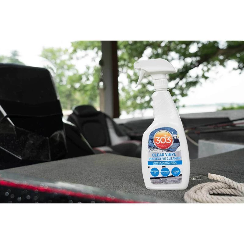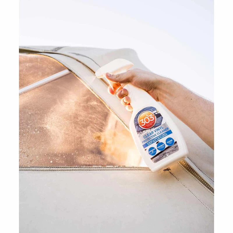 The constant exposure to the sun, saltwater and freshwater spray can leave windows in canvas enclosures and dodgers cloudy and difficult to see through. To stay ahead of these damaging elements, regular cleaning and maintenance is important. 303 Clear Vinyl Protective Cleaner is ideal for keeping clear vinyl, Stratglass® and Eisenglass in canvas clean and protected. This alcohol and ammonia free product is easy to use and applies with a microfiber cloth. The streak free formula offers excellent UV protection. Stay one step ahead of Mother Nature to maintain a clear view with 303 Clear Vinyl Protective Cleaner.