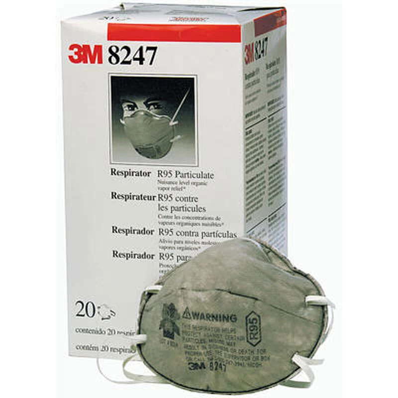 The 3M Particulate Respirator 8247, R95, with Nuisance Level Organic Vapor Relief is NIOSH approved R95 and consists of a carbon layer that helps reduce nuisance levels of organic vapors.