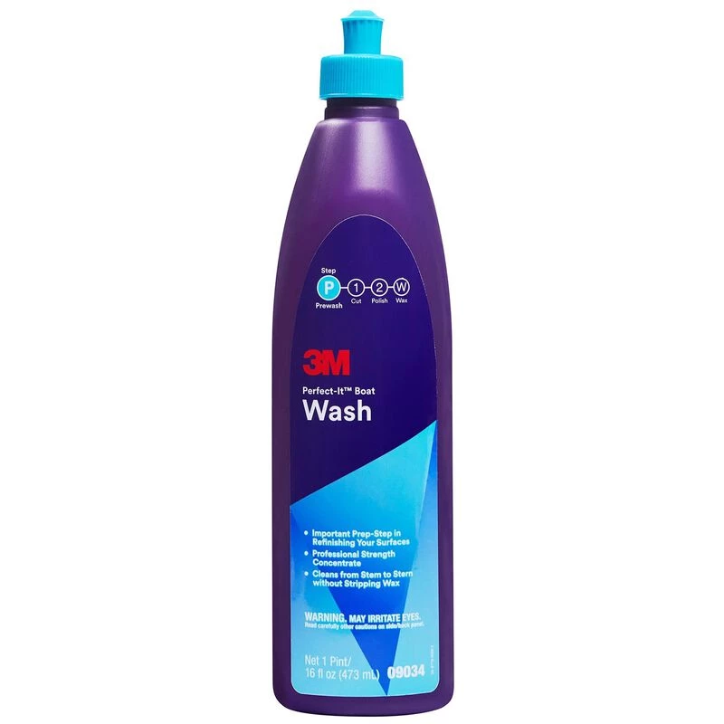 3M’s Perfect-itâ„¢ Boat Wash cleans a variety of boat surfaces. The product is a professional strength concentrate, one pint makes up to 16 gallons. It works safely and without stripping wax.