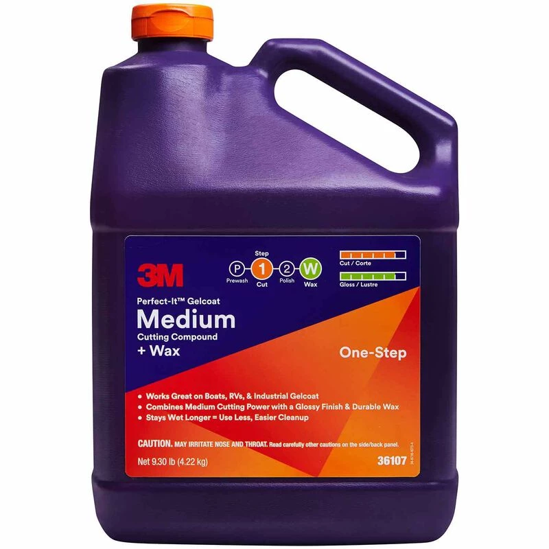 3M’s Perfect-Itâ„¢ Gelcoat Medium Cutting Compound+Wax is a one-step solution for major gelcoat refinishing. It quickly removes major defects—scratches, oxidation, chalking or water marks. It also provides a durable protective wax with a high gloss. Gallon.