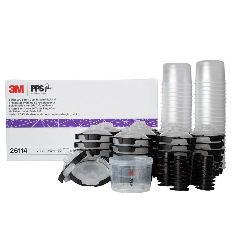 3M™ PPS™ Series 2.0 Spray Cup System is the next generation, highest performing disposable spray cup system for mixing/measuring, filtering, spraying in any direction (360° spray rotation) and protecting coatings not in use. Each lid and liner kit contains 50 disposable lids with integrated collars and full diameter filters, 50 disposable liners, 1 reusable hard cup and 32 sealing plugs.