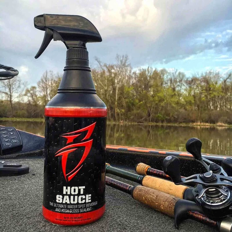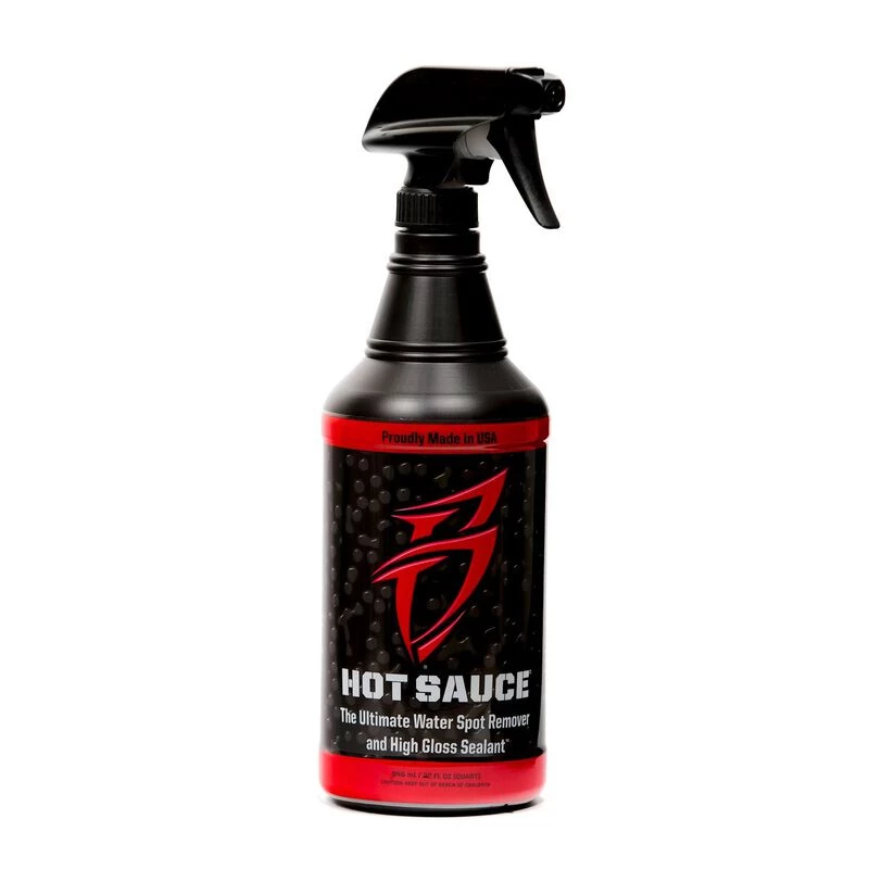 If water spots are a problem, Boat Bling Hot Sauce is your solution. The flagship of the Boat Bling Sauce line, Hot Sauce is a mist-and-wipe water spot remover with high gloss sealants. Hot Sauce can be applied wet or dry, leaving a streak-free shine. Boat Bling Hot Sauce is unique in its ability to remove water spots while protecting and maintaining your wax finish.Â