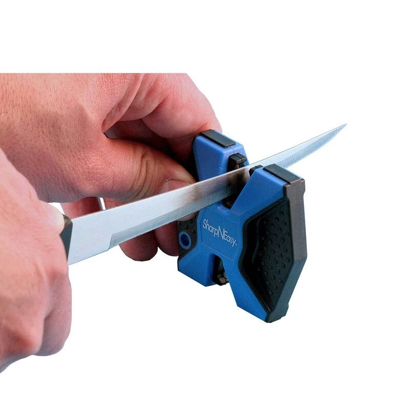 The SharpNEasy® 2-Step Knife Sharpener is an innovative tool that everyone can use. The ceramic rods, dark for coarse and white for fine, are exactly what you need to care for and maintain your blades. The two stages allow for the proper angle every time by having two stationary ceramic rods molded into the base. The 2-Step Sharpener also has over-molded grips. The over-molding process allows the user to have a comfortable and secure grip while sharpening. The unit has a lanyard hole which allows for easy attachment to cord or string.