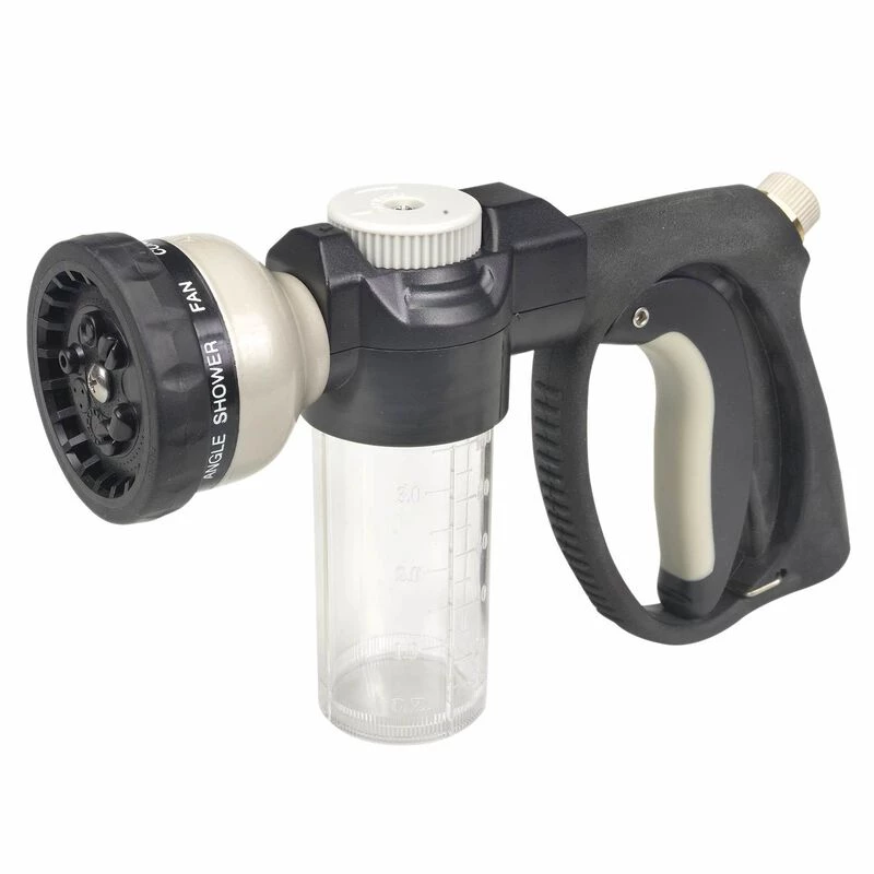 - Nine-pattern nozzle, in-line soap reservoir, trigger control