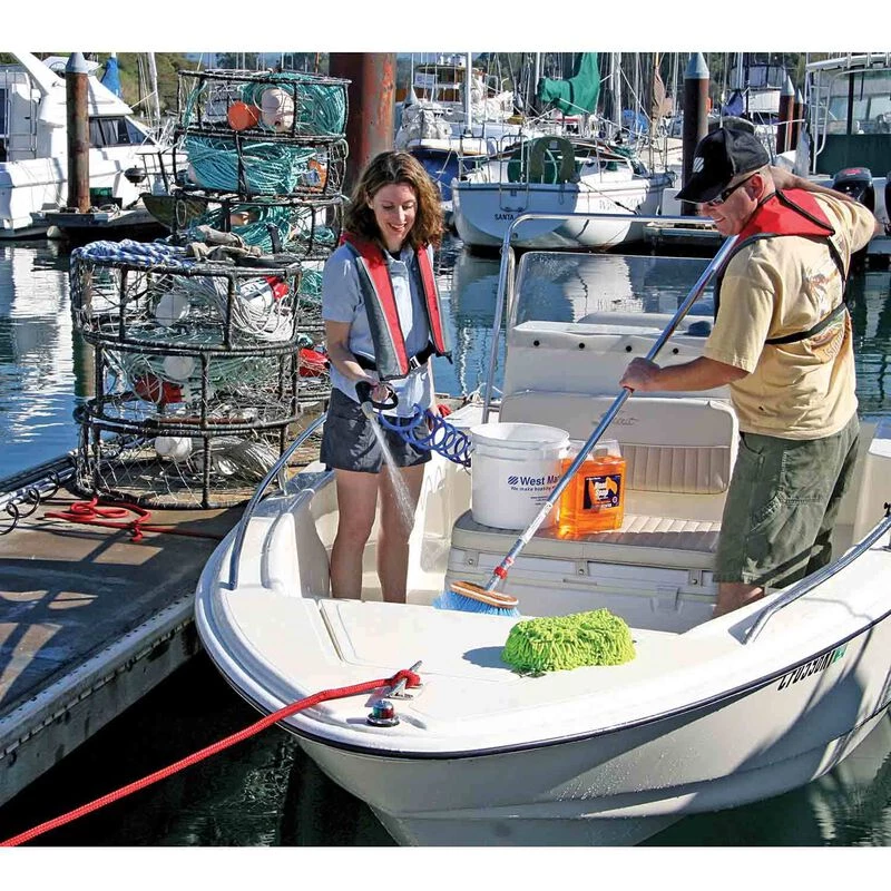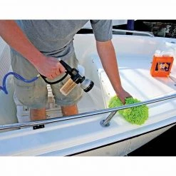 This rugged “bucketless” washdown system makes short work of wash down jobs. Features include an adjustable nine-pattern nozzle, in-line soap reservoir, soft fingertip trigger control, comfortable contoured rubber grip, variable flow adjuster and stainless steel components.