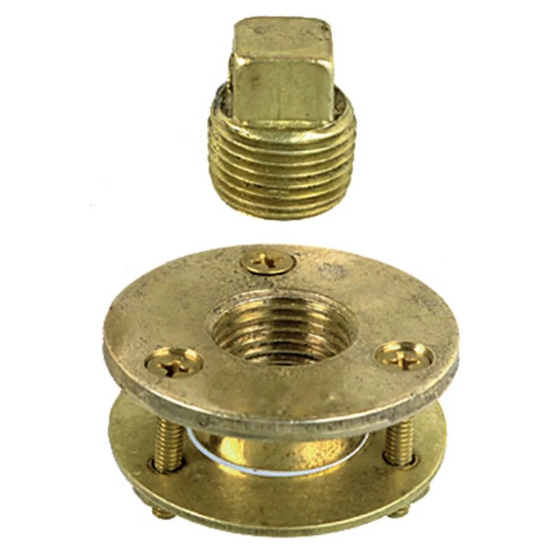 All styles have a nut-type plug with 1/2″ NPT threads for a watertight fit. All are cast bronze for corrosion resistance, with a 2″ OD flange predrilled and countersunk for #8 screws (sold separately). Some styles have a stainless pin for easier plug removal by hand. Maximum hull thickness for styles with brass backing plate is 7/16″.
