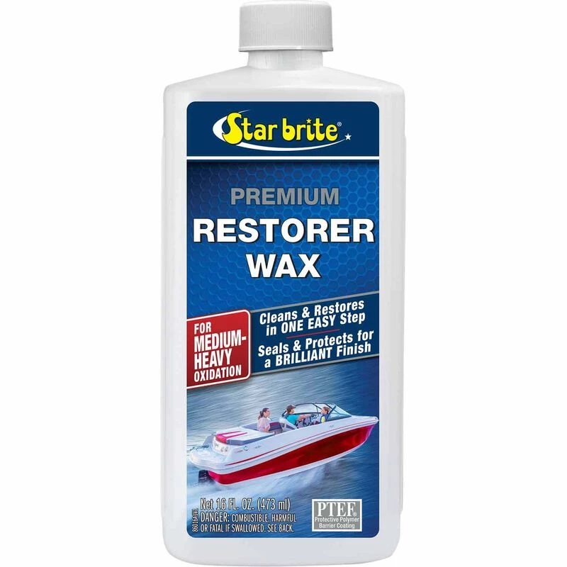 STAR BRITE Premium Restorer Wax is a one-step formula that easily removes medium to heavy chalk and oxidation while leaving a durable, protective coating. No hard rubbing or buffing required. Special uv inhibitors guard against fading, and eliminate the need to use rubbing compound, followed by wax.