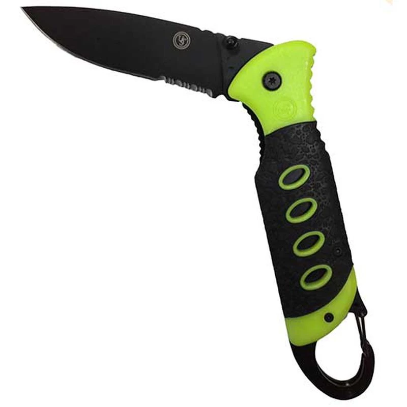 The perfect knife for small jobs or emergency use at home or on your boat, this knife is rugged, durable and made of high-quality steel. It features one-handed open/close, a tough, 3mm. thick blade with serrated edge, TPR handles with bead-blasted texture for a secure grip, and a liner lock design for added safety during use. The black-oxide coated blade is rust-resistant and holds an edge.